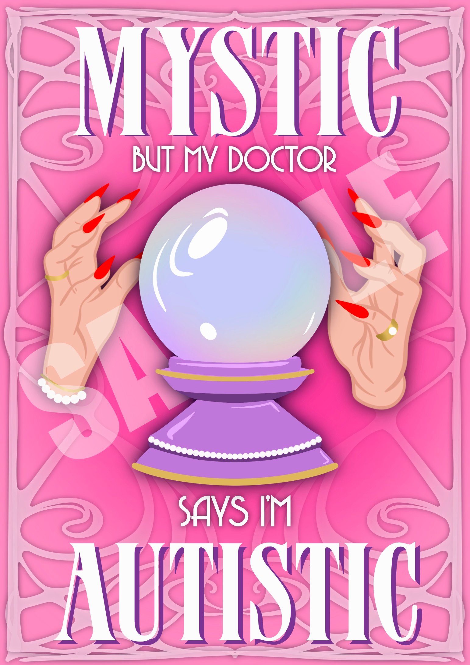 Add a little magic and humor to your walls with this “Mystic but My Doctor Says Autistic” art print, a playful design celebrating neurodivergent identity with a mystical twist. Featuring a crystal ball illustration, Art Deco inspired details, and bold pink tones, this print blends spiritual aesthetics with relatable autistic humor.